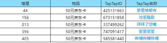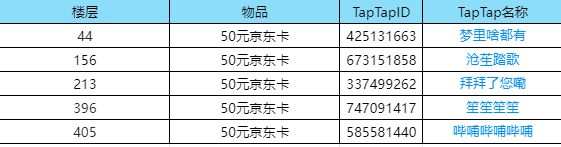 恭喜上述中奖玩家!请联系客服QQ:800182542,上班时间为10:00-22:00,期间可以为您登记噢,届时需要提供【TapTap账号截图(位置在-设置-账号与安全)】和【中奖楼层截图】进行信息核对。确认中选并提供了信息后,请耐心等待,我们会在15个工作日内发放奖励。