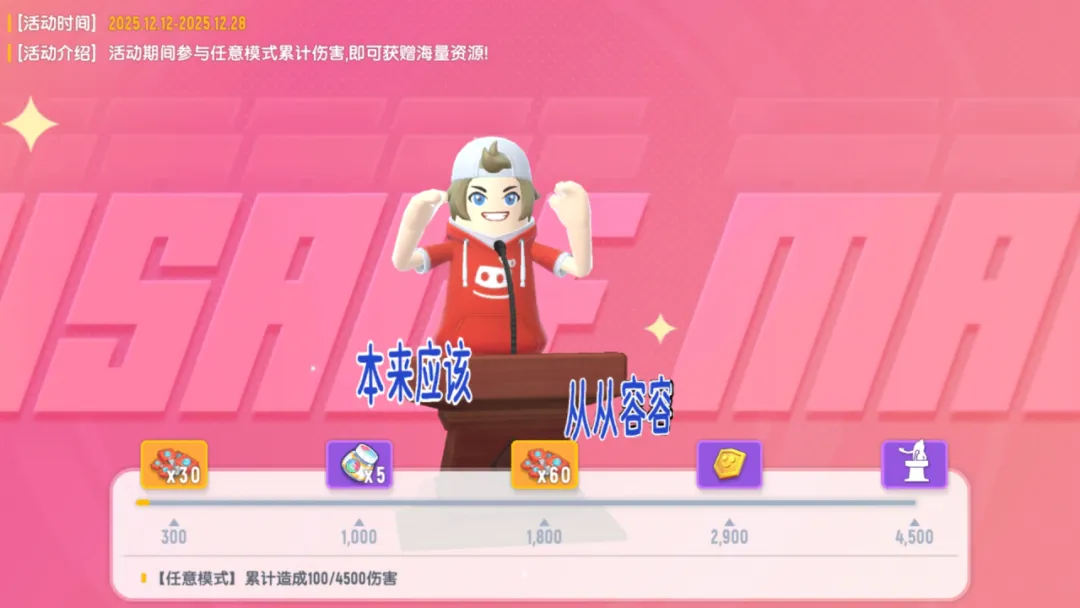 活动期间肠肠参与任意模式对局,只要累计造成指定伤害数,即可领取丰富奖励!缤纷补给箱钥匙、高级染色剂还有超实用的免哭金牌,以及本次活动限定的【从从容容】战场动作,全部都能轻松带回仓库!