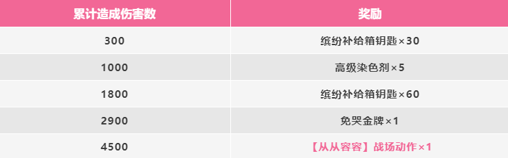 只要肠肠们在活动期间,参与任意模式累计造成伤害,就能逐步获取战场动作等超值奖励,一起来看看活动详情吧~