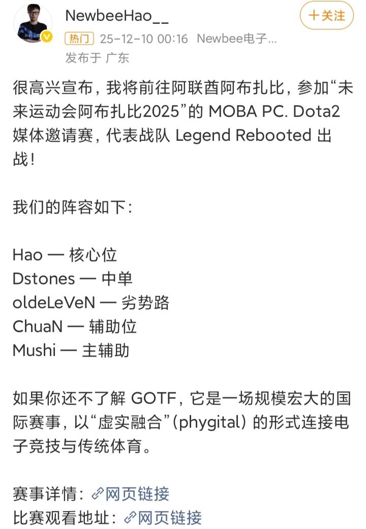 12月10号,Hao和cty分别宣布,将带队参加阿布扎比2025未来运动会,即国际版“DOTA2老头杯”!