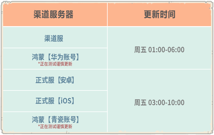 我们预计在本周五(12月12日)对服务器进行停机维护,为了确保版本稳定性,我们将错开不同渠道服务器的更新时间,本次正式服各渠道更新时间如下:
