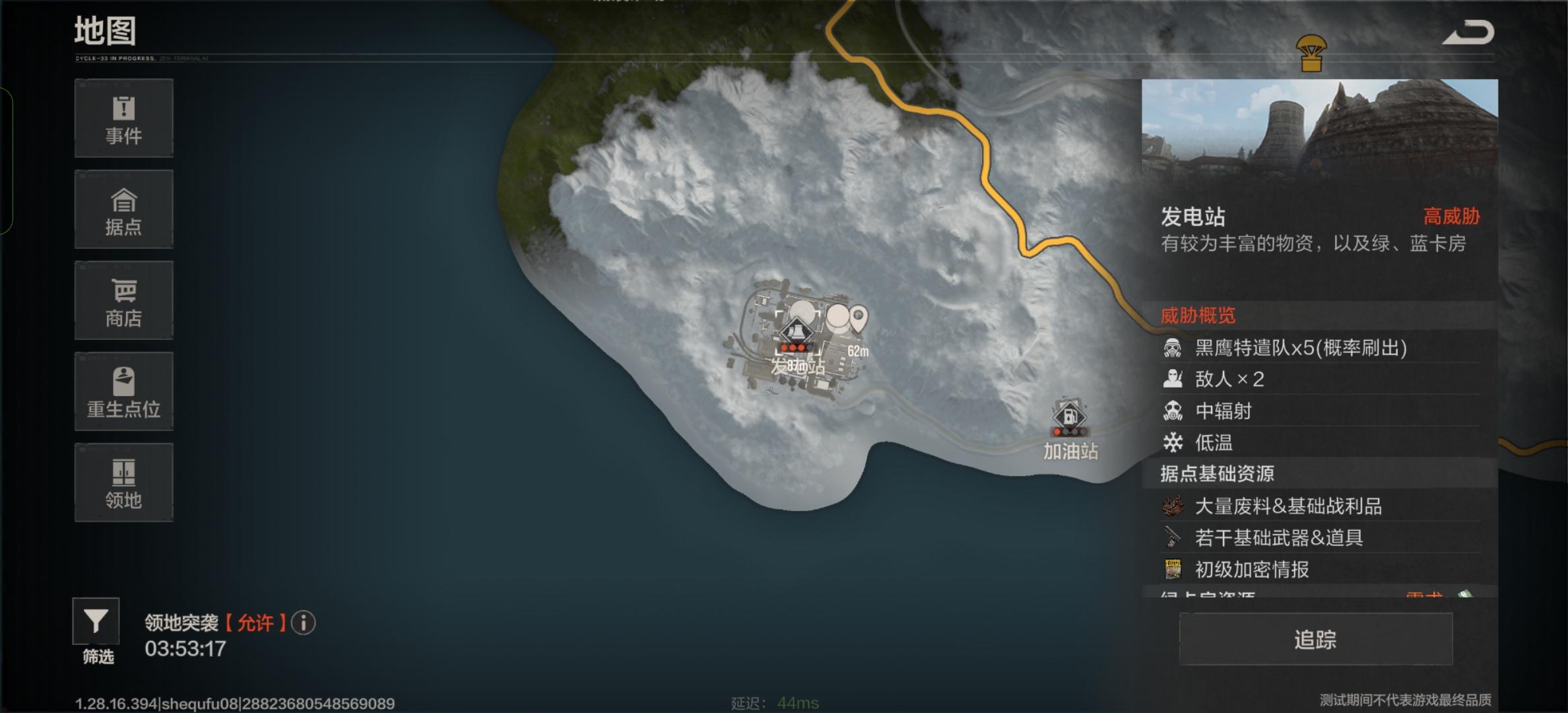 发电站属于高价值资源核心点,属污染区域,辐射值较高,需要辐射值达到50%便可以安全进入,内部含多类关键设施与高级物资,是中后期发育核心目标点。