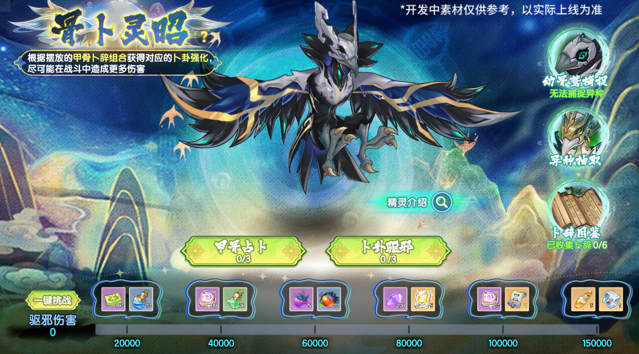 跟随古法步骤进行甲骨占卜获得卜辞,使用卜辞进行组合求得卜卦,卜卦能够赋予精灵不同的战斗BUFF加成,与灵卜骨鹫并肩作战,赶走祸乱的邪祟!每日最多可进行3次甲骨占卜及3次卜卦驱邪,根据驱邪伤害值解锁相应的奖励。