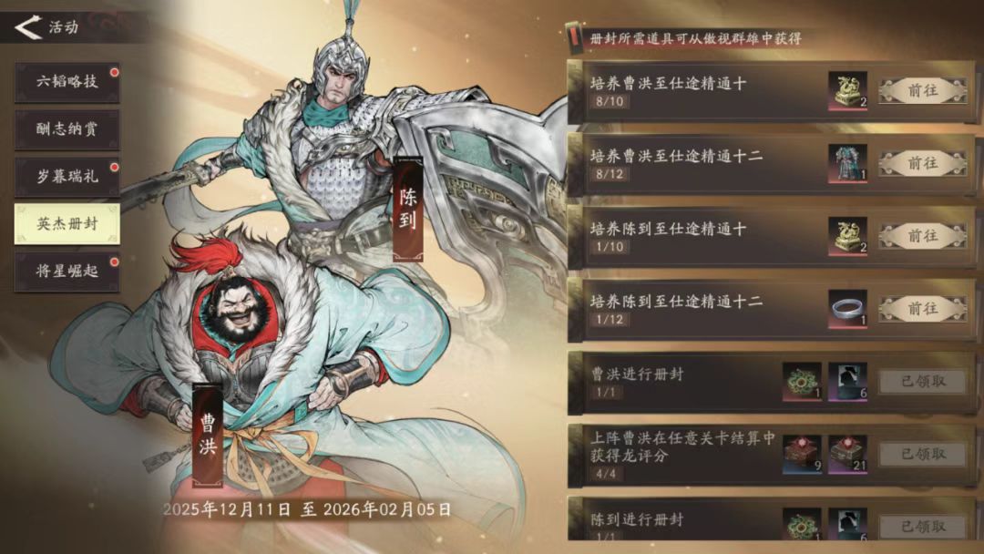 在即将同步开启的英杰册封活动中,明公册封曹洪、陈到并达成培养目标,还可以获得举才玉、金印紫绶、60级深华甲等丰厚奖励!不容错过!