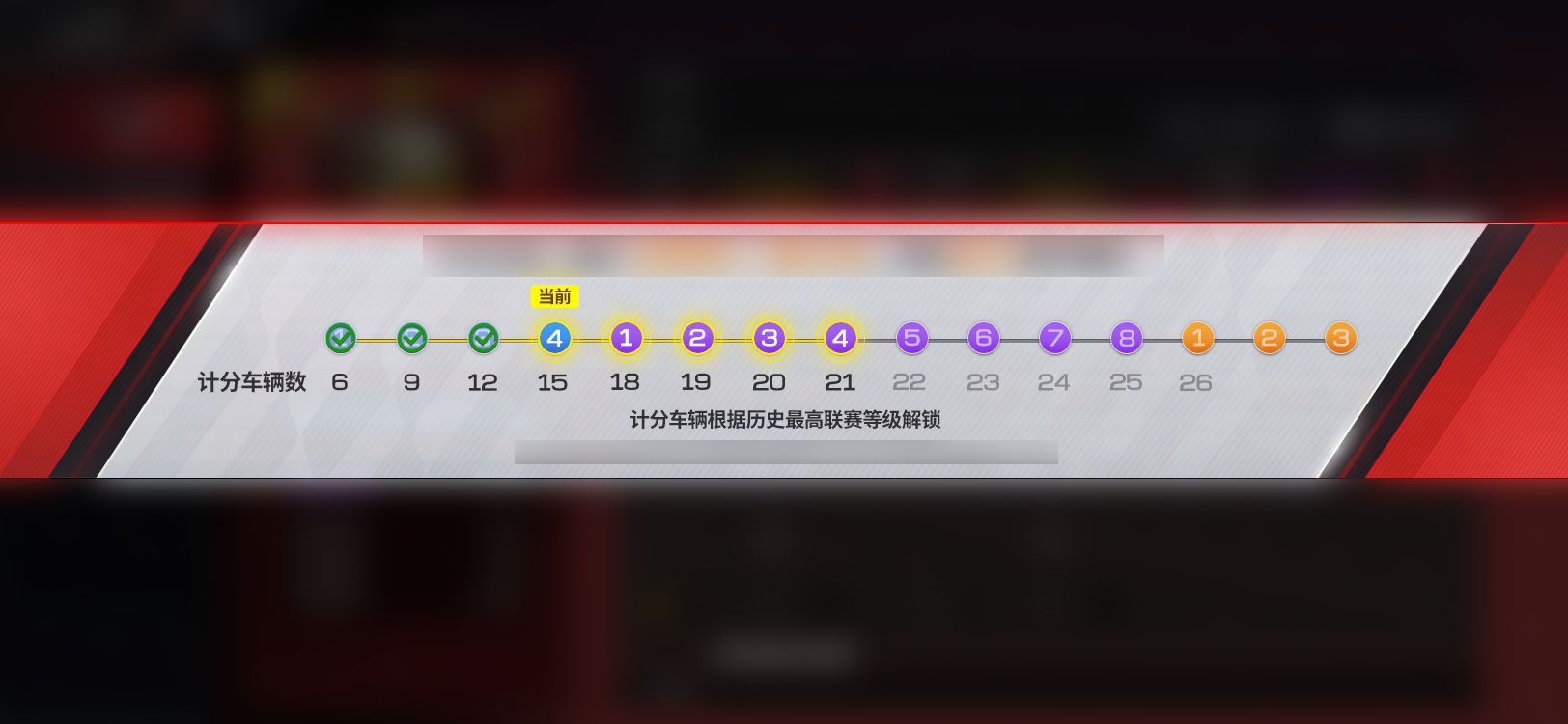 计分车辆:新秀/精英联赛每升1级,解锁1个计分车槽位(巅峰1级解锁第27个后不再增加);