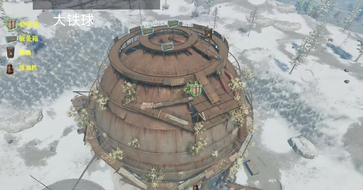 大铁球是一个资源丰富的刷物资地点。资源:红油桶(低品质燃油和原油)、绿皮箱(武器和装备)、物资箱(材料和废料)、原油(可用于启动矿机)大铁球下方:大铁球下方有大量红油桶,可获取劣质原油。旁边可能有炼油机,若未被使用,可直接加工原油。大铁球内部:顺着大铁管进入大铁球内部,圆盘上会刷新两个物资箱,物资随机。