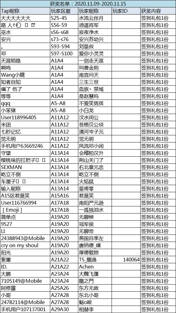 恭喜以下主公在本周的签到活动中获奖,奖励将在1-3个工作日内,通过签到预留的信息,发送至您的游戏内角色下邮箱内,还请留意查收!