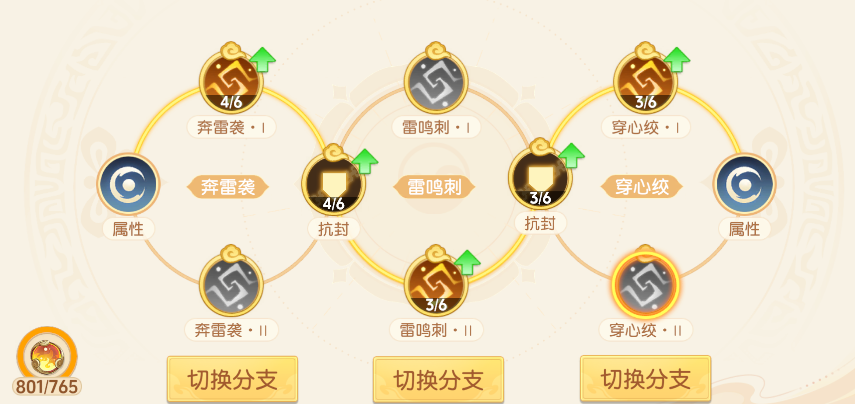 横扫千军:35点战役的群攻技能,相比于雷霆万钧,这个技能的性价比极高,伤害倍率略高于雷霆万钧,释放技能后获得6回合15%的增伤效果,在增伤的回合内获得雷印的时候有35%的概率额外获得一层雷印