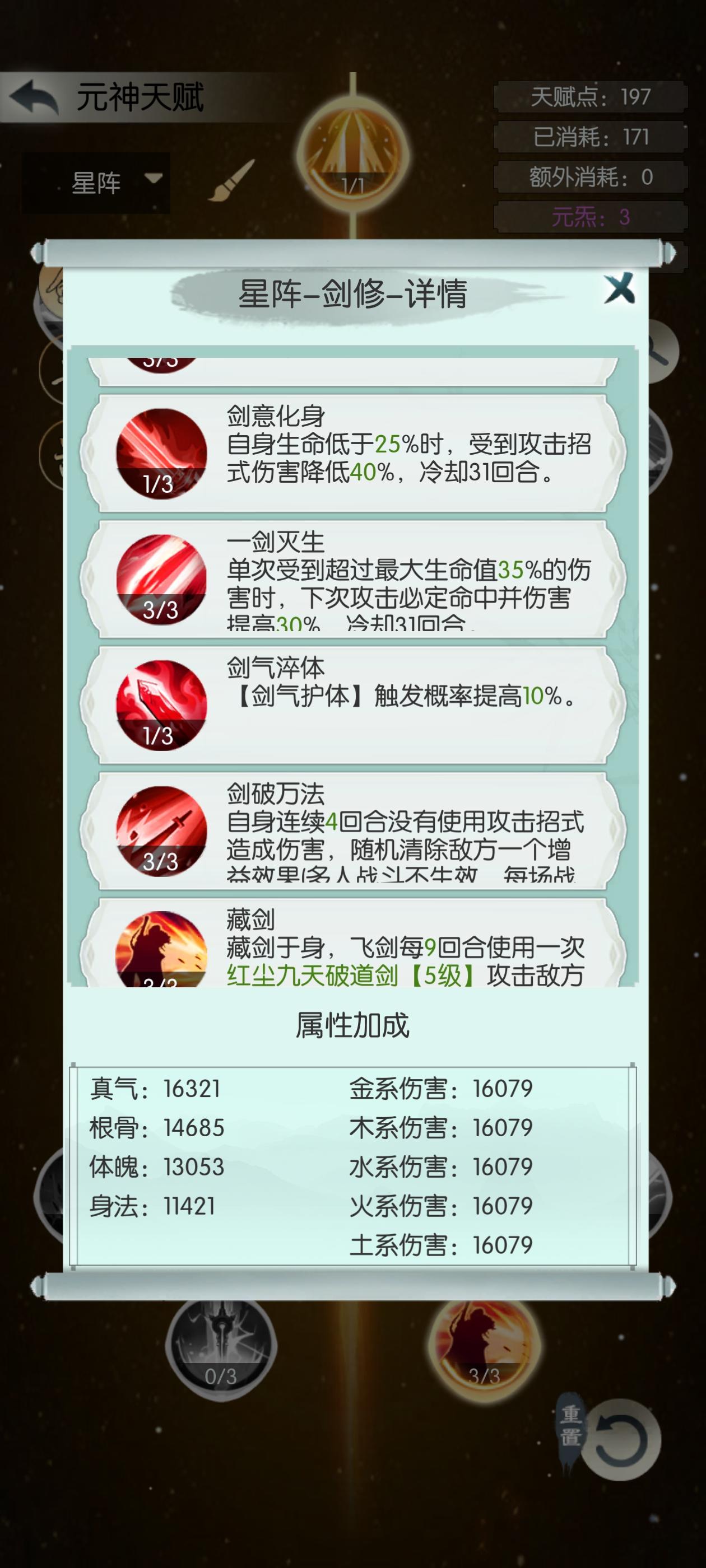 剑意化身只点1级,不点剑刃格挡(可根据自身卡血情况调整)