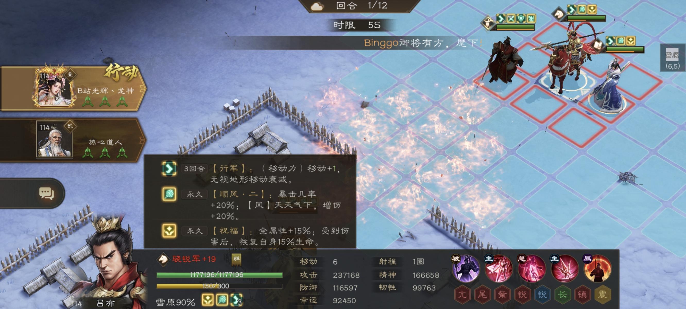 而踩中之后我方群体就会获得一个buff(包括友军),移动+1且获得恶路移动,因此吕布2号位刚好可以使用aoe刮到boss,此时练度高的已经可以秒杀boss了,如果秒不掉,就靠郭嘉诸葛亮或者队友来收尾即可