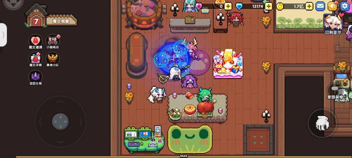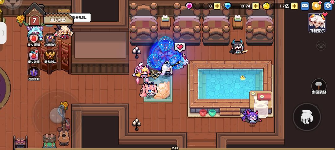 魔女城堡里,像素木板地踩上去总带着暖暖的质感,今天逛小屋时,先撞见中央那团晃眼的蓝色魔法光效,像揉碎了一片星空搁在这儿。转身看到泳池安在屋角,清凌凌的像素水波晃悠悠,紫发魔女蹲在池边不知道在鼓捣什么,贝利亚尔的头像挂在右上角,安安静静当个背景板。