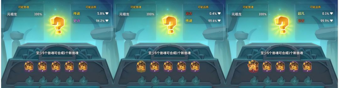 这是以小博大的阶段,合成超凡兽魂的基础概率较低(约0.1%),主要依靠运气博取上限,保底为远古兽魂。