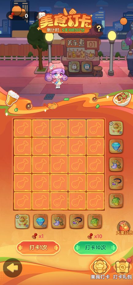 夜市翻牌乐翻天,好运连连赢大奖!用【打卡印章】可开启翻牌,翻到每轮棋牌的大奖则自动解锁所有奖励,清盘后可解锁新新摊位哦~勇闯美食摊,脚步不要停!