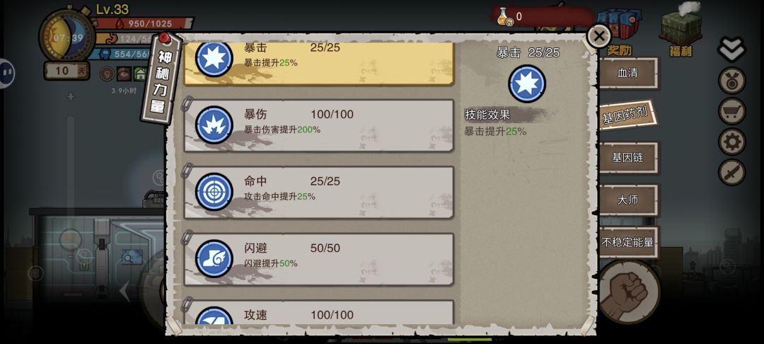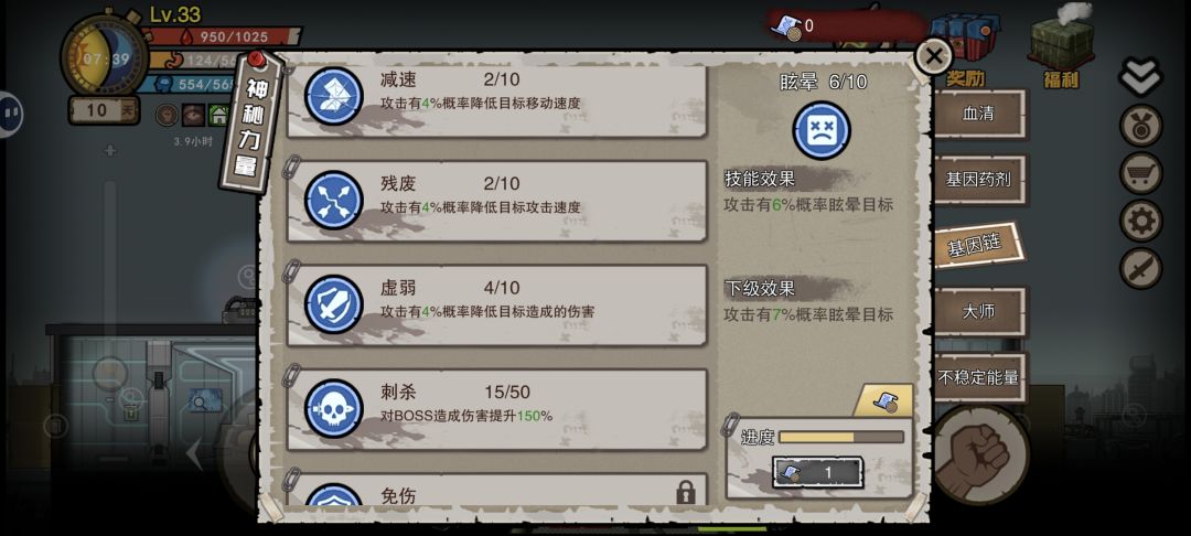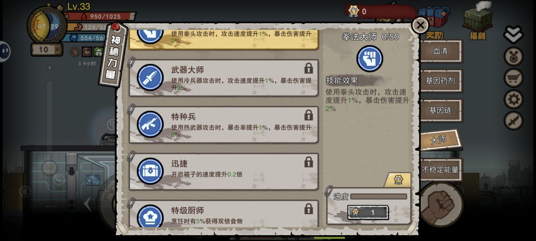 神秘力量是直接给的加成(尽力升),前4种感觉提升挺大。大师勋章目前没有合,不知道勋章与芯片除了声望与钻石买之外其他的获取渠道。第5种费资源提升慢还不稳定(击退功能可以个人选择升不升,如果用拳头或者冷兵器自动攻击,可能会在击退怪物后继续跟进攻击而进入怪群,或者打boss的时候突然来一个击退会影响节奏)