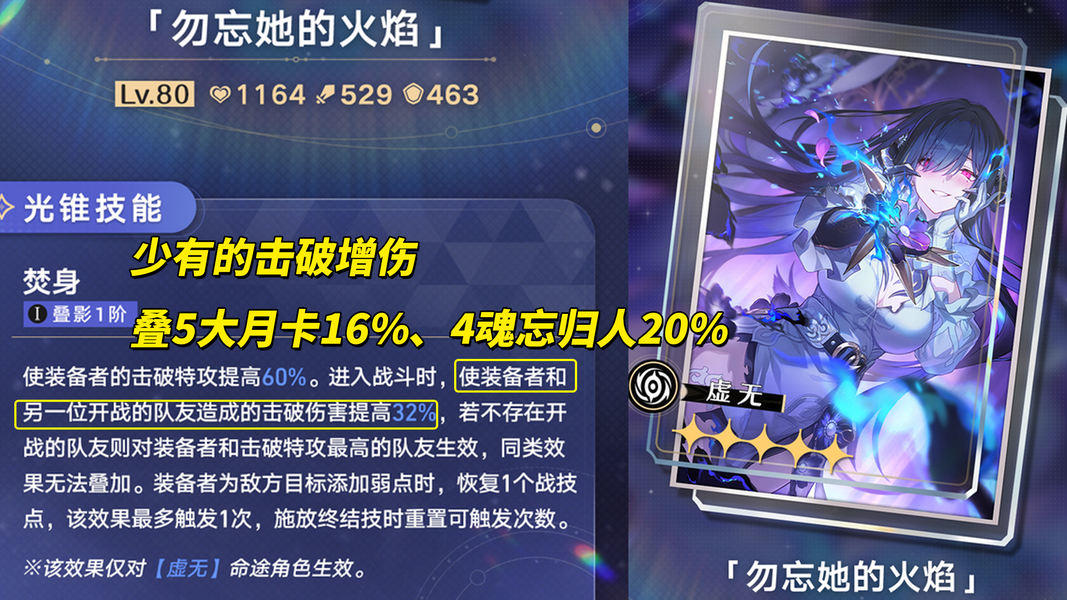 新光锥「勿忘她的火焰」核心机制,装备者与开战队友造成的超击破伤害提升32%。相同效果的只有叠5大月卡光锥16%与4魂忘归人20%,对大多数玩家来说,基本可视为“独立乘区”。
