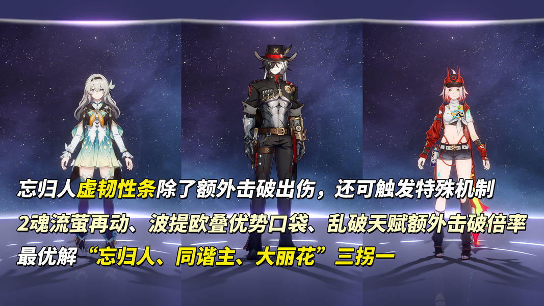 ②无忘归人的玩家。此时可组“击破C+阮梅+同谐主+大丽花”,此队伍中大丽花替换忘归人,伤害有提升,但少了虚韧性条也有对触发主C机制上的亏损。最优三拐一依旧还是,大丽花+忘归人+同谐主。