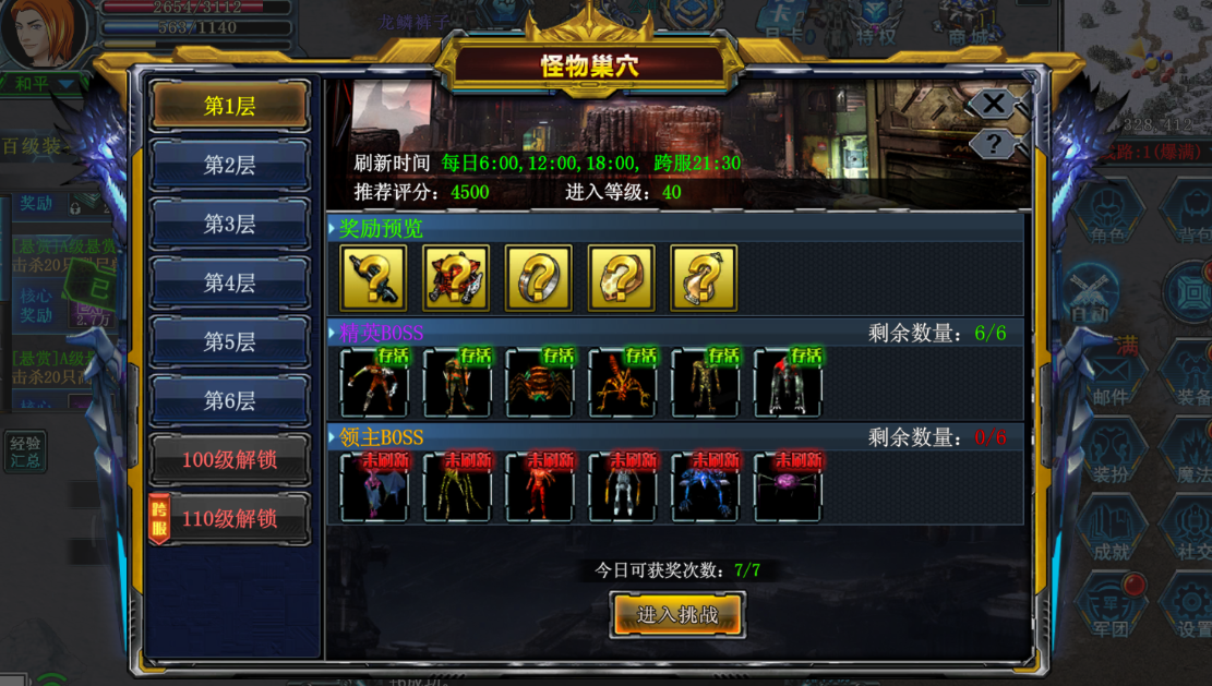 玩家等级达到40级即可解锁第一层巢穴,此后每提升10级开放下一层级,层级越高,奖励品质越卓越。