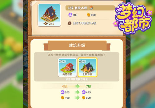 这些基础住宅都可以通过升级获得不同的外观变化。特别的是,当住宅突破5级后再升级,就有机会随机获得全新的外观!另外,这些随机外观的获取概率不同。如果玩家有幸获得极其稀有的建筑外观,那真可以把这栋住宅当作地标,放在地图的醒目位置,让市民们好好“瞻仰”一番!