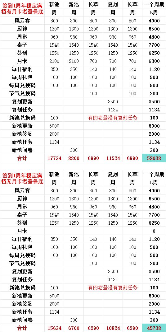由于某些不知名原因,最近新池持续时间越来越长,所以在公式里我们把上限拉到20天(实际上好像只有周年这次是20天,前几次大概17-18天),每轮活动平均时间拉到16天,此时可得月卡最大收益约为30r=7000玉,平均收益约为30r=6000玉。