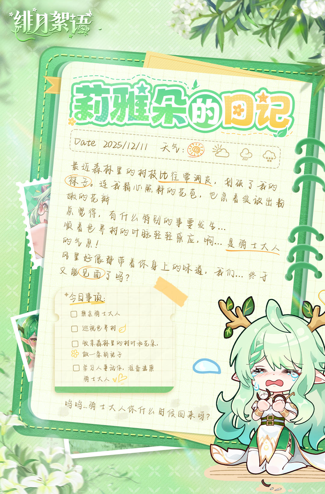 最近世界树森林里的生灵都比平时要躁动,这让莉雅朵很是苦恼。