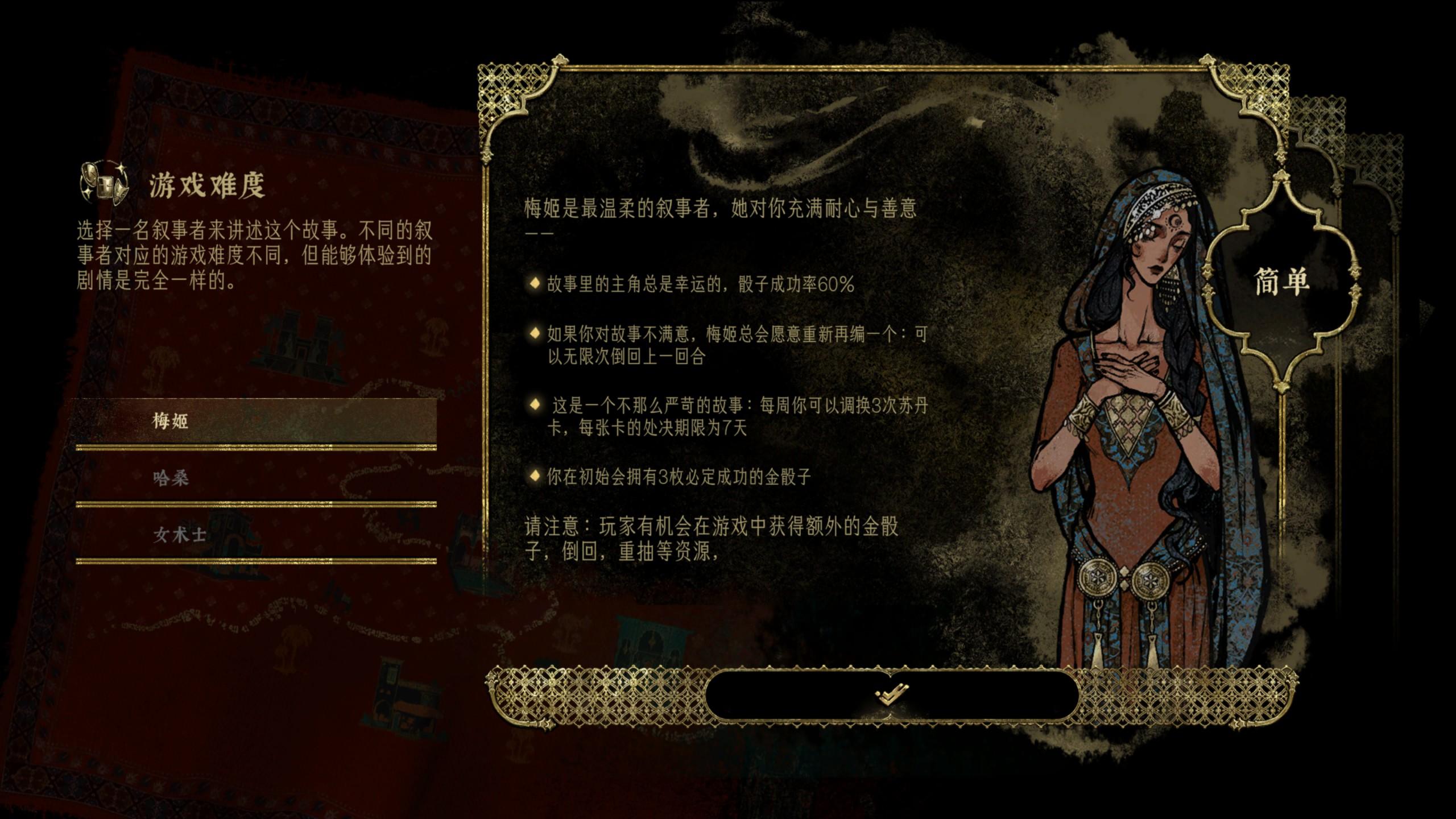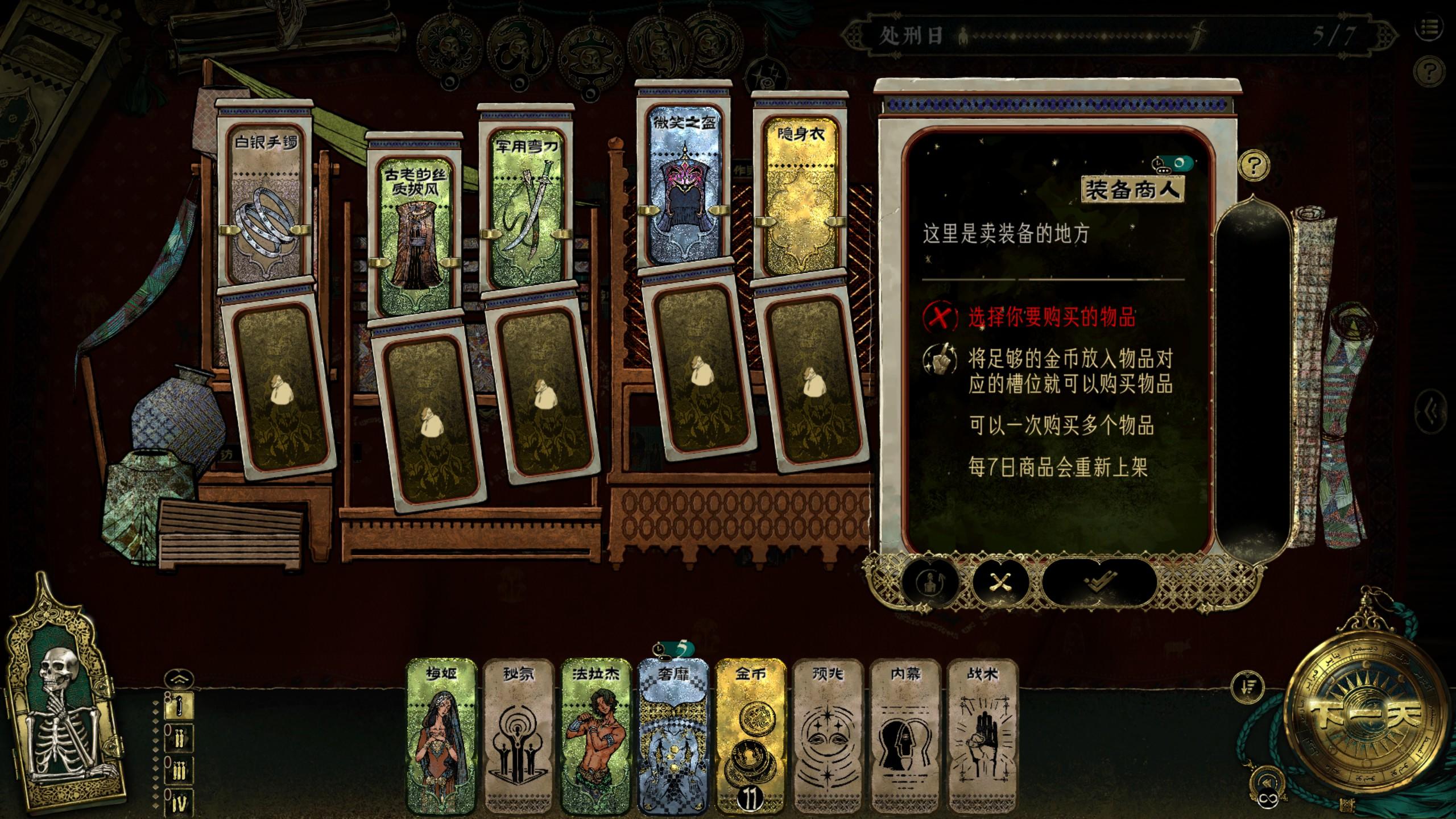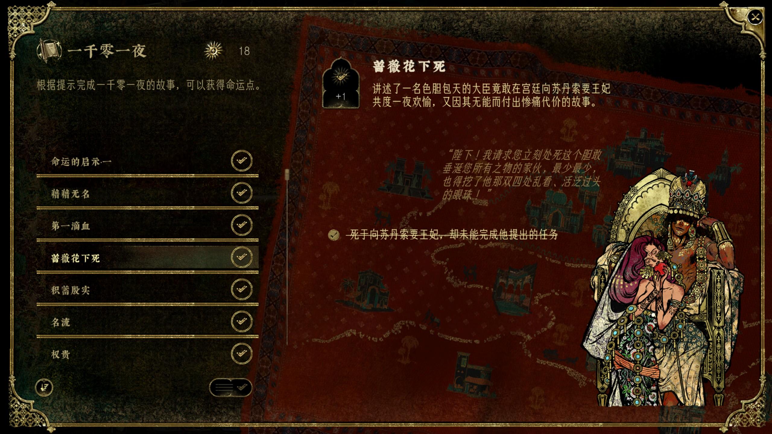 本作的局外成长倒是挺有意思的,除了增加开局的人物以及金币储备之外,还有秘密双胞胎以及解锁密教的关键道具,能够改变游戏中的部分剧情和完全不一样的剧情线。所需要的点数可以在一千零一夜里看到挑战选项,或者在每局折断苏丹卡,每折一张给一点之后就可以前往命运商店里购买相应的升级选项。
