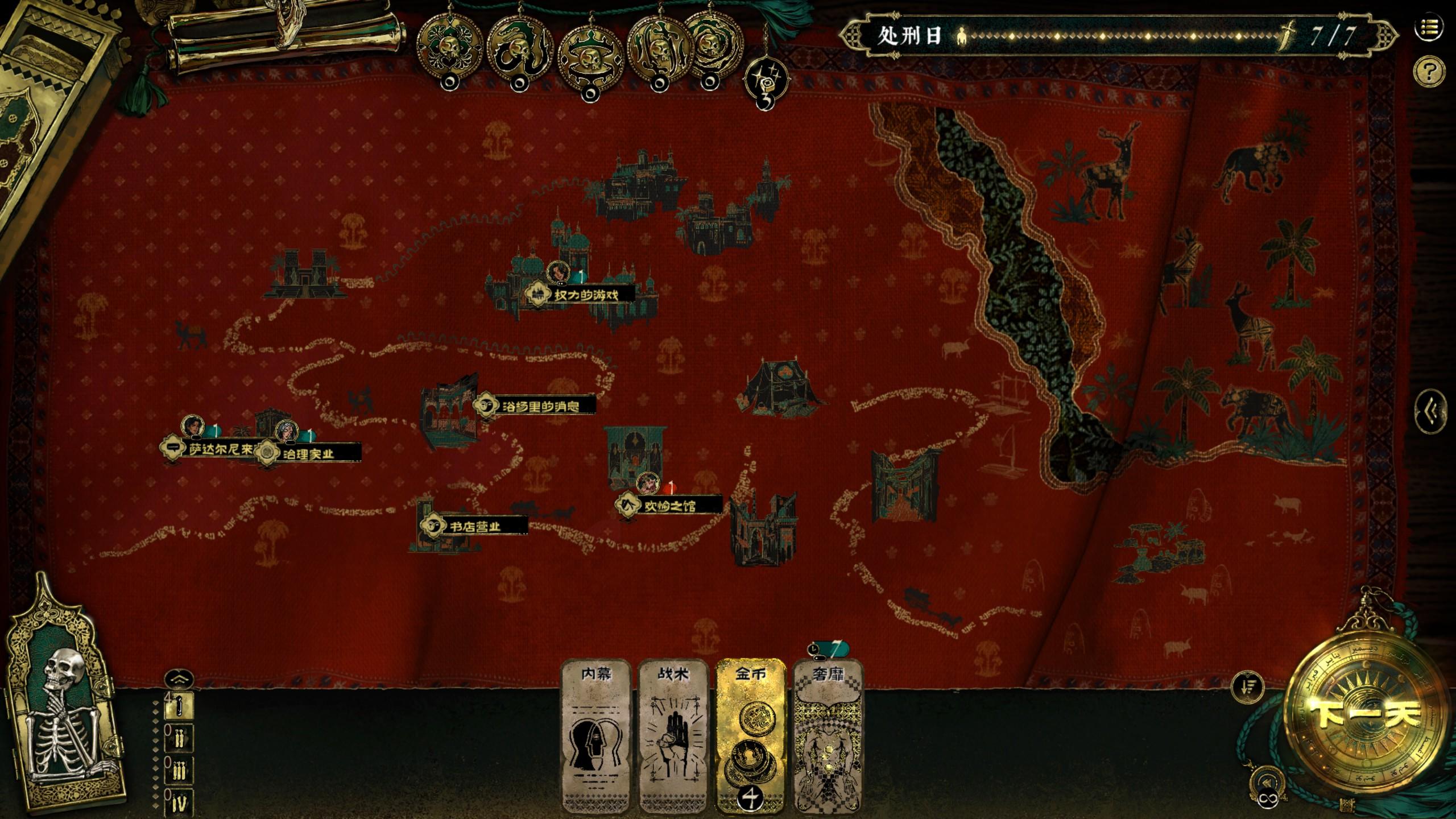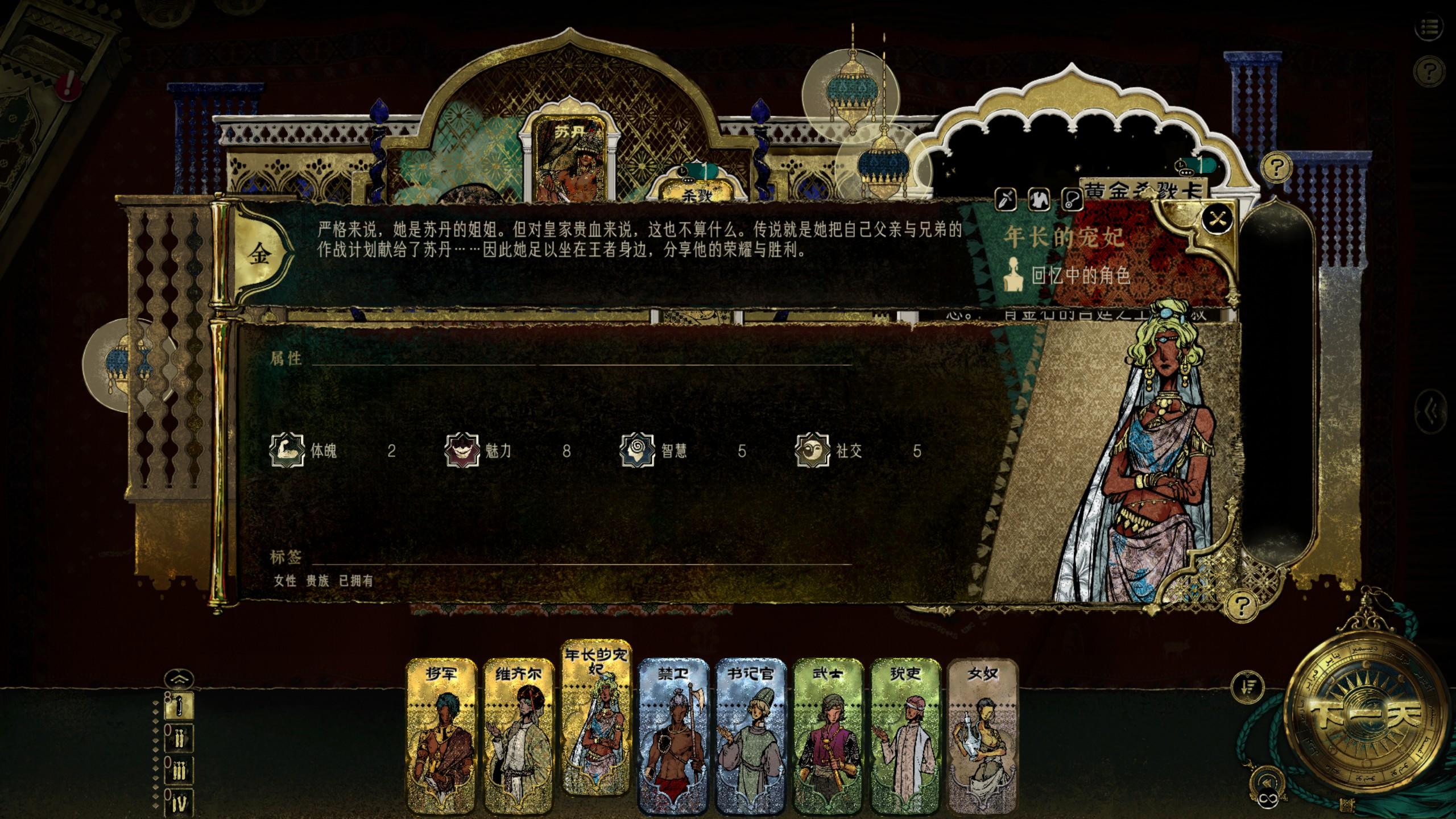当进入游戏之后,玩家是一个贵族,需要经营家业获取金币,也需要派人去苏丹面前为自己美言,并且获得灵感卡牌。闲暇之余就可以去浴室收集情报或者去书店买书,当然,那个时代也有妓院。初始的建筑就这么多,第一天就要抽取苏丹卡,此时不管卡的种类,如果保持在青铜级及以下,那么就很容易完成,强烈推荐卡点完成,不然的话发展会跟不上。