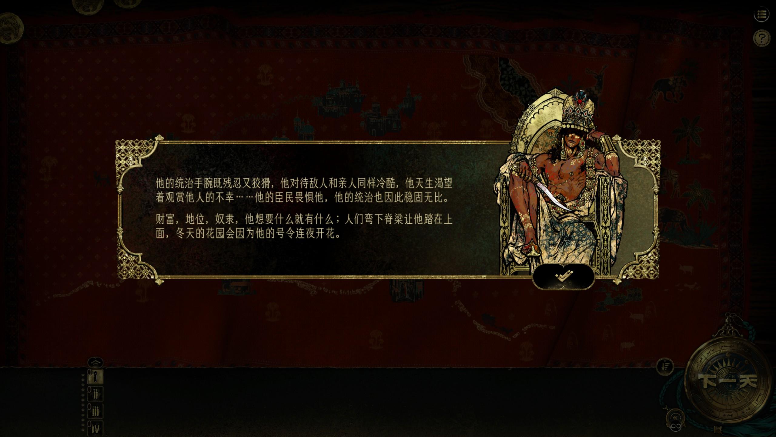 通关这个游戏的方式也有很多种,也能体验到不同人物之间的故事,很像角色扮演。正所谓伴君如伴虎,苏丹这个猛虎就像一个暴君,是要当一个革命者将政权推翻还天下一个太平,还是要明哲保身去努力取悦苏丹呢?还在等什么?不妨来试一下这款精彩刺激的游戏,你能在多久完成这个游戏呢?#pc游戏攻略评测 #steam游戏 #单机游戏 #发现好游戏 #浅评一下