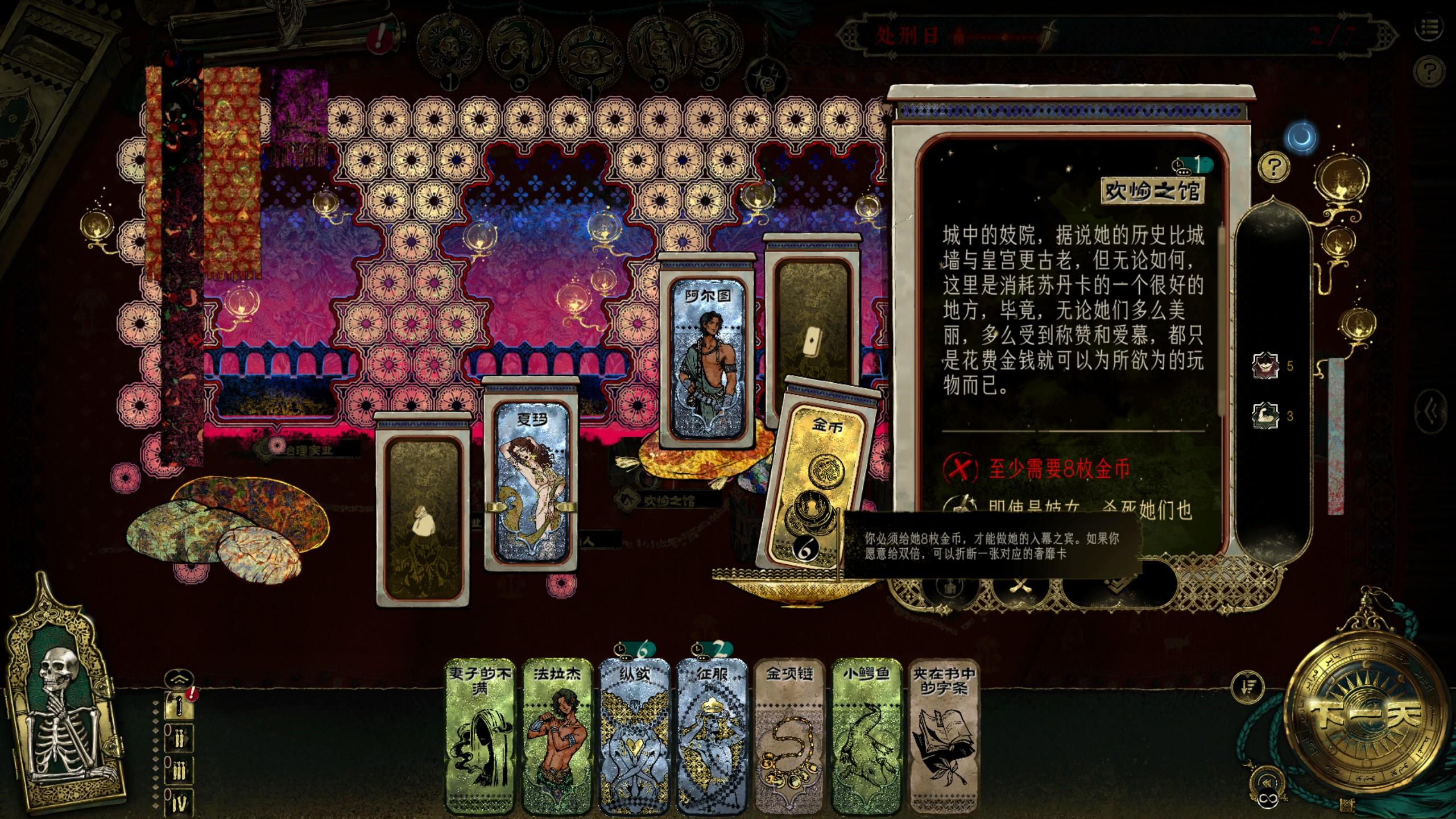 这就得说到游戏的主要玩法,是要通过消除苏丹卡来给自己续命,每张卡有七天的时间消除,还有不同的品质,品质越高,要满足的条件也就越高,付出的代价越昂贵,甚至只有几个特定的事件才能消除。
