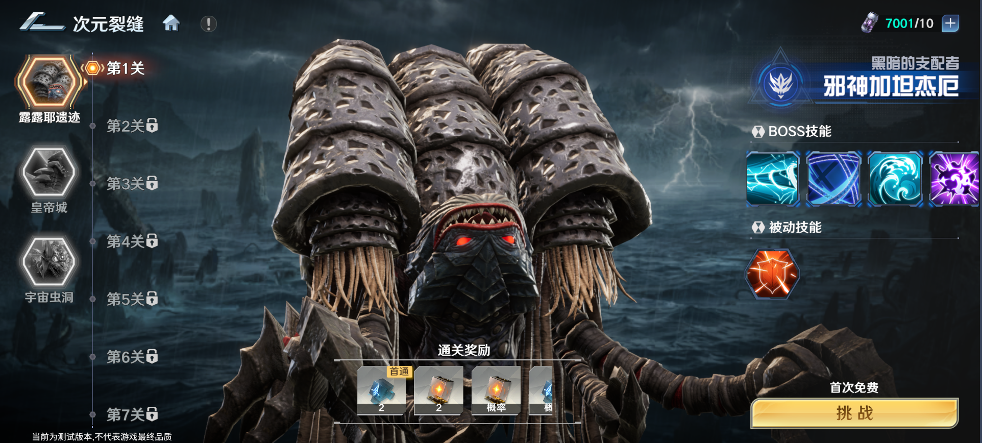 次元裂缝共设三大副本:【露露耶遗迹】、【皇帝城】与【宇宙虫洞】,分别对应不同的剧情背景与强敌。击败各个副本的BOSS,将可获得对应角色的潜力养成珍稀道具。