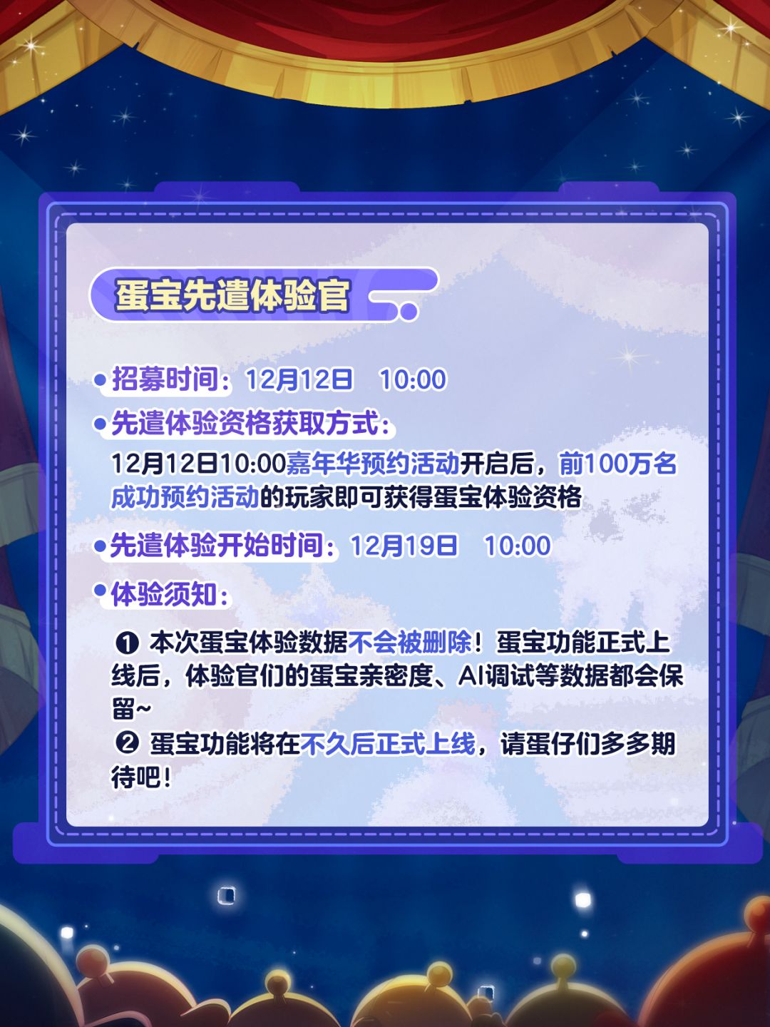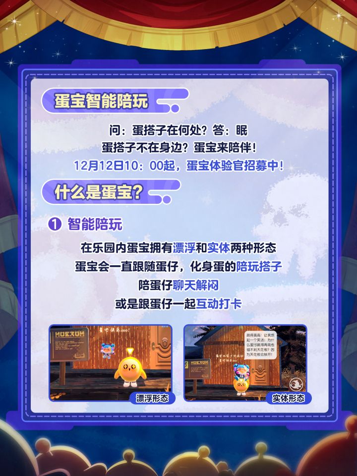 12月12日10:00嘉年华预约活动开启后,前100万名成功预约活动的蛋仔即可成为蛋宝体验官,抢先一步与蛋宝见面!