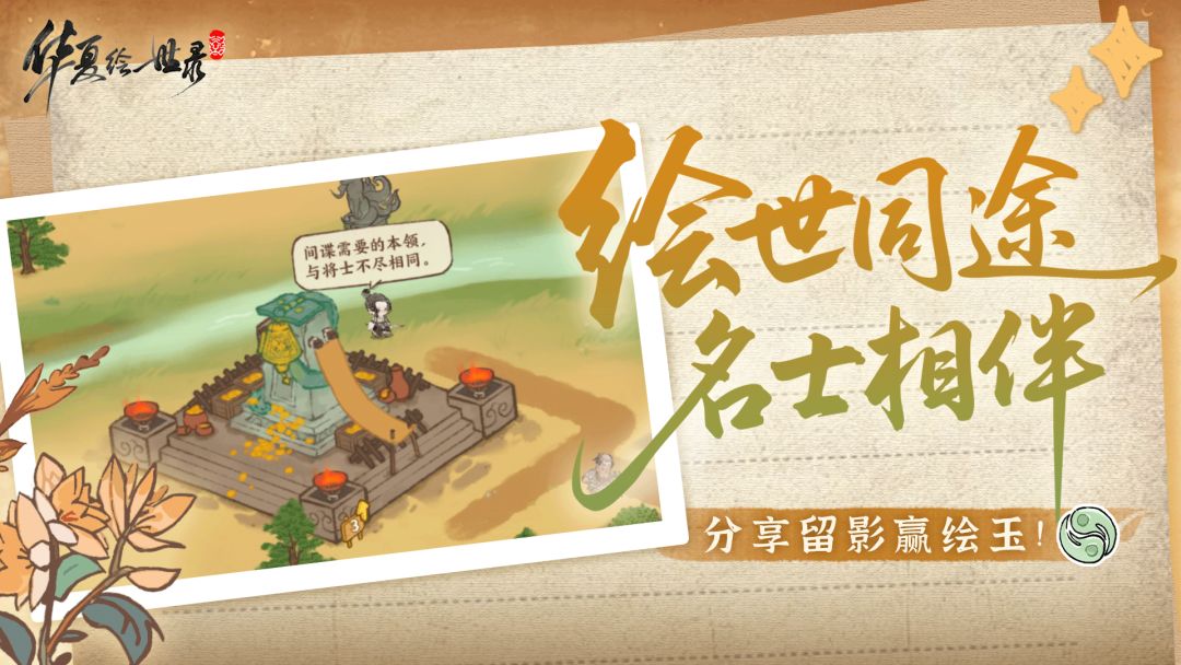 现在,定格你与名士的专属羁绊瞬间 —— 无论是飒爽的战斗身姿,还是温馨的漫游画面,分享就有机会赢取限定头像框还有精美绘玉奖励,让这份情谊在绘世山河中永久流传!