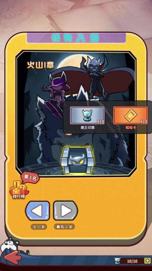 怪物入侵每十关为一章节,通过一章节后,可获得章节奖励,奖励为呱呱卡和魔王印章,魔王印章可用于继续挑战下一章节,若魔王印章不足可随时间恢复或通过金砖购买。