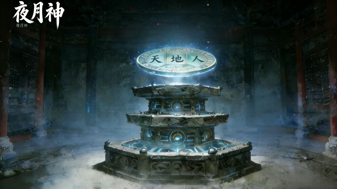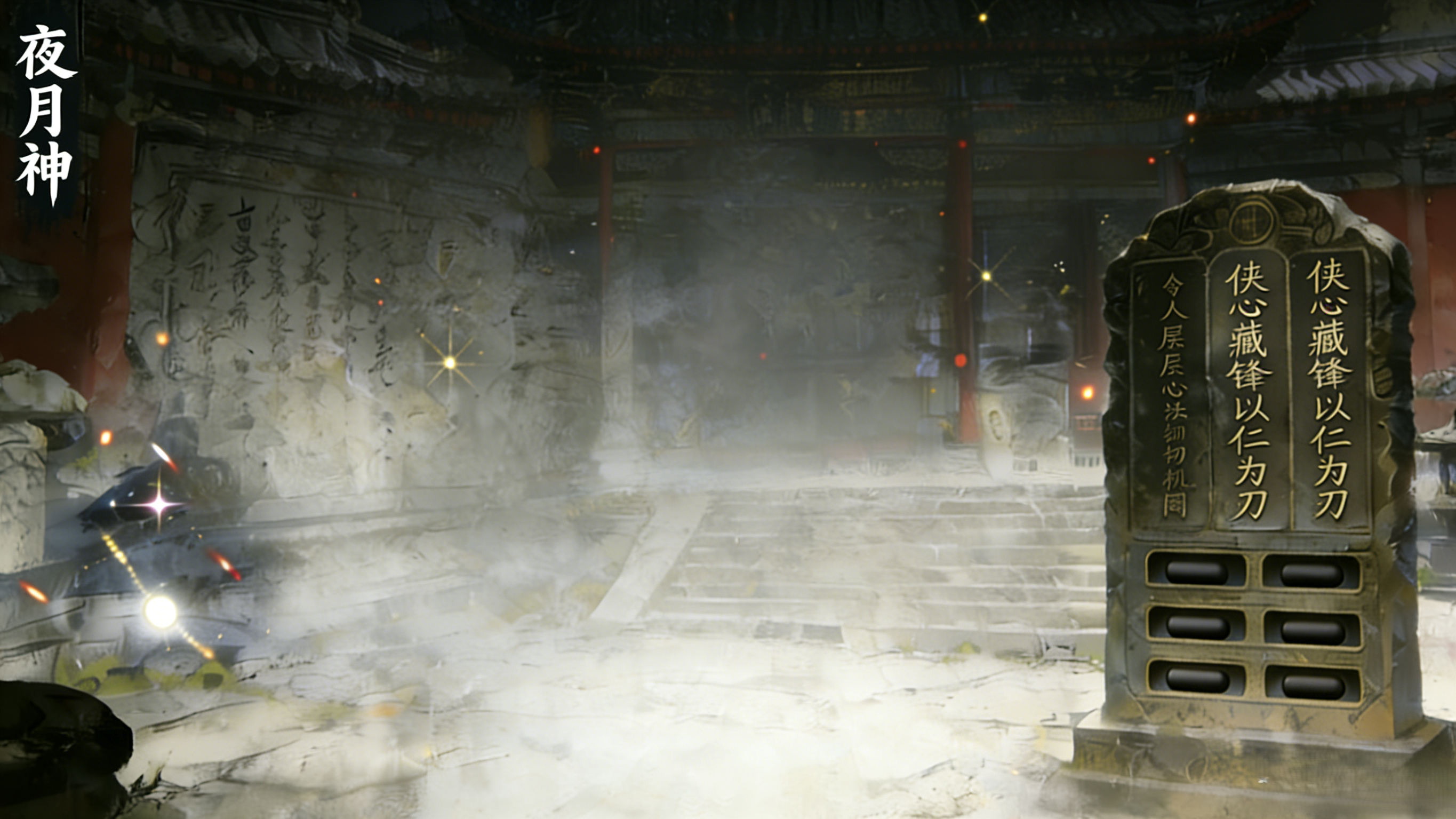 场景:秘阁中央矗立着一座三层石制机关台,台身刻满墨门机关纹路,顶层悬浮着 “三才玉盘”(天、地、人三格对应不同纹路),台侧立有一尊墨门传人幻影,手持残缺的《机关谱》拓片。叙事:墨门曾为守护古寺秘宝,以三才之道打造机关屏障,唯有参透 “天合星象、地应五行、人合心法” 的真谛,方能解锁秘宝,幻影将作为指引者,在关键节点给出模糊提示。