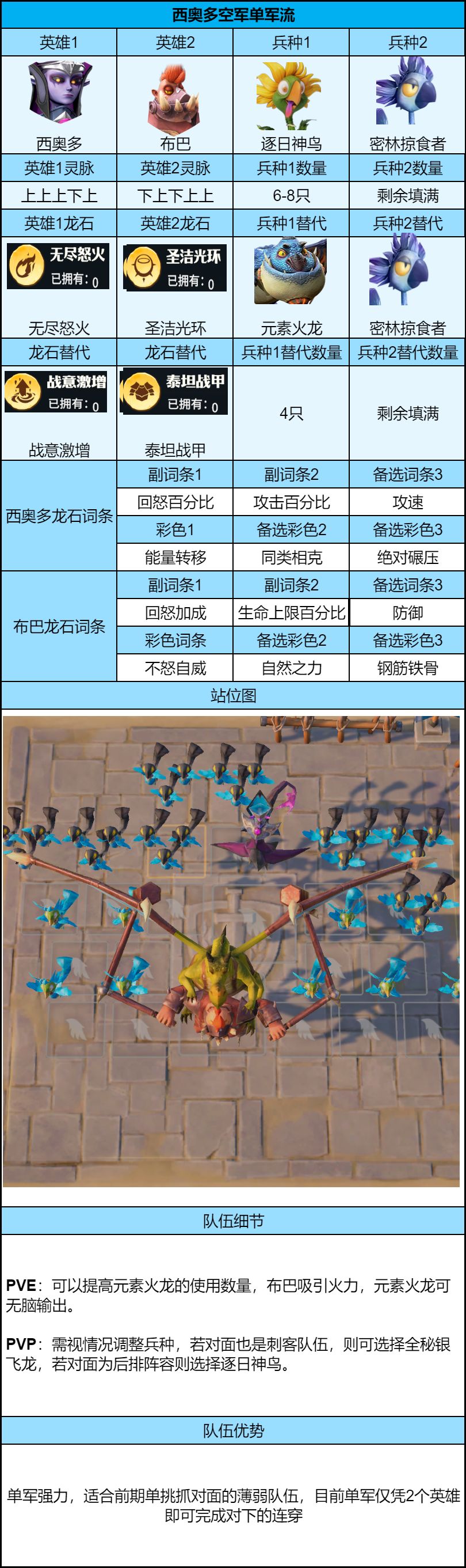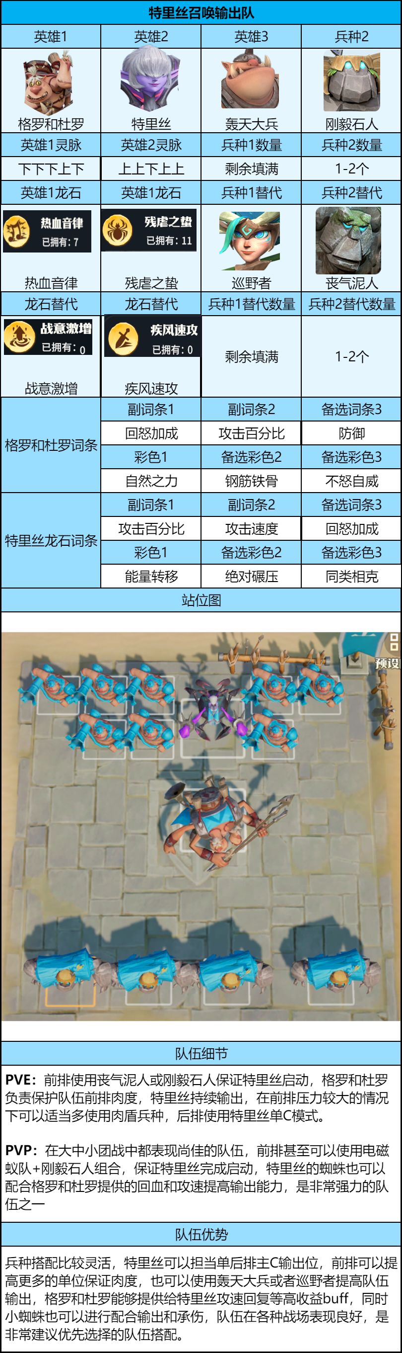 2、主流兵种巨力橡果和自爆蚁队在轮换列表,本赛季无法使用,建议多使用轰天大兵,密林掠食者等强力兵种,后排兵种巡野者强度不错,建议根据战场替换。