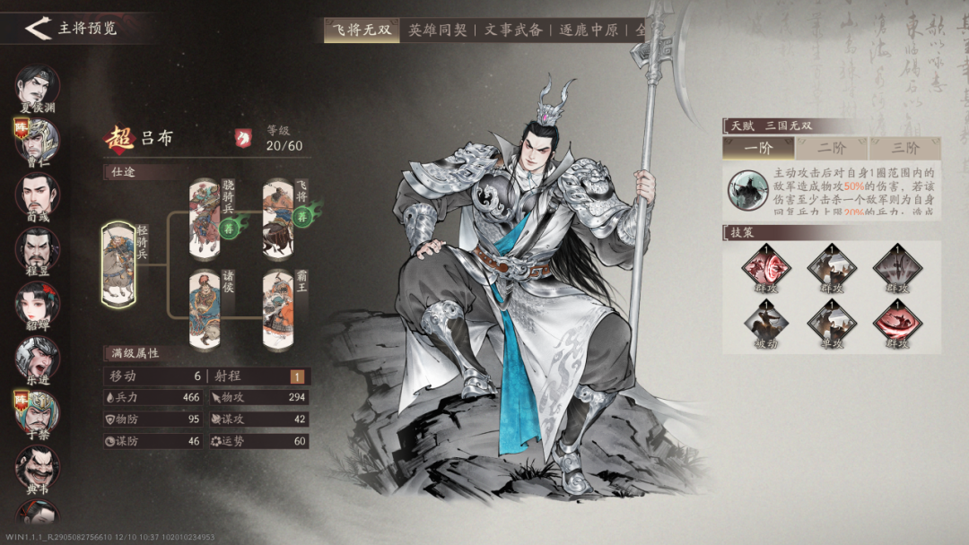 吕布是超级别强力骑兵/统帅系主将。天赋【三国无双】可消耗斗气激活无双 buff,该状态下,吕布将获得物攻物防提升、攻击无视敌方防御、攻击范围扩大、主动技能全面增幅的强力加成,将其无双战神的顶尖威能体现得淋漓尽致。进位选择