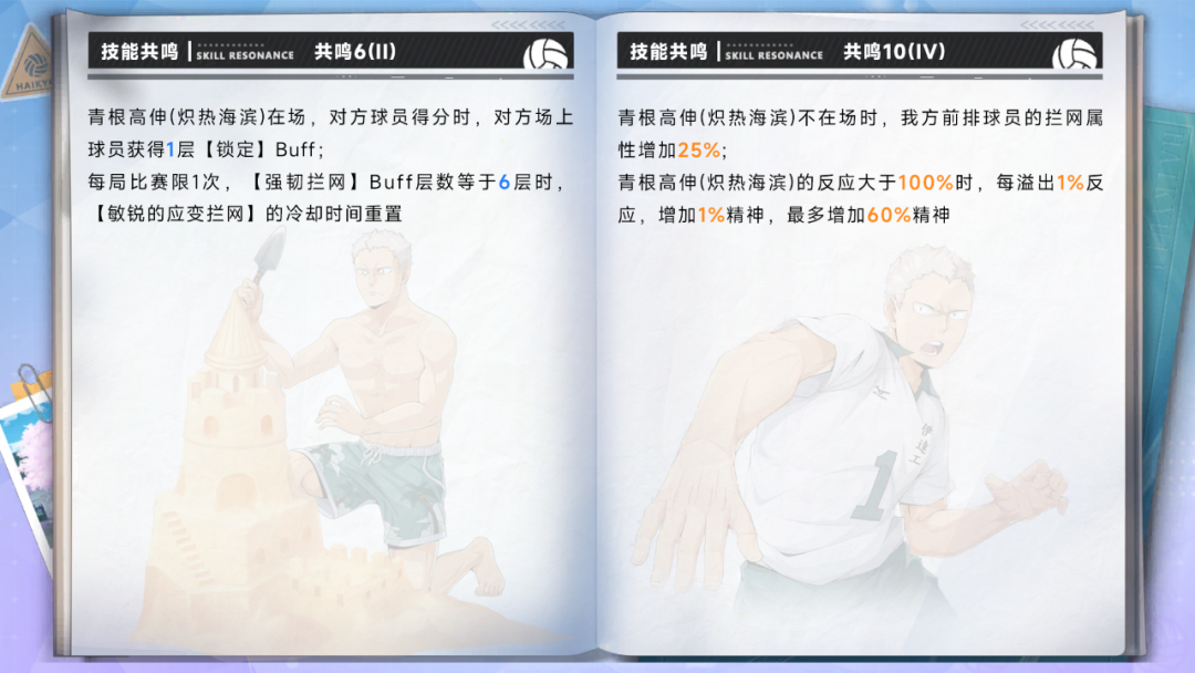 共鸣 6(刚需):对方得 1 分,青根直接加 6 层【强韧拦网】(得 3 分加 12 层),实测每局能轻松叠到 16 层以上;哪怕只当关键发球员,也能轻松吃满离场技的 15% 双端技巧加成,是青根发挥价值的核心门槛;
