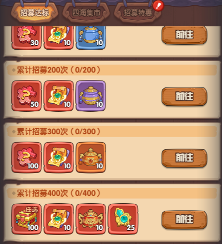 此外,游戏中会循环开启魔罐/招募达标活动。在对应活动期间会记录主公通过开启魔罐所获得的魔气值(每8000积分一轮),或者累计的招募次数(每400次为一轮)。每完成一轮活动,均可领取大量奖励,包括武将碎片、元宝、魔罐等珍贵资源。而每一轮的最终奖励更为丰厚——含有可用于兑换神兵的神兵令和100个红色武将自选碎片宝箱,是快速提升主C战力的关键途径。