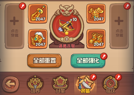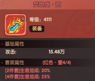 此外,当武将穿戴的4件基础装备中,有任意2件处于同一进阶阶段时,即可激活套装效果。前期资源紧张时建议优先升级“剑”和“甲”,优先提升攻击力,提升我们的推图速度。