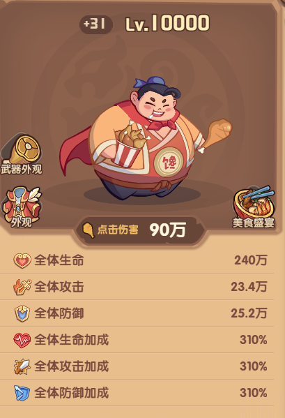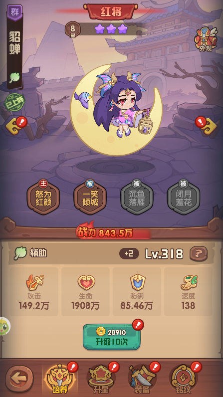 我们可以通过消耗铜钱和进阶丹来提升阿馋的等级,为全队提供属性加成。因为武将等级是无法超过阿馋等级的,因此前期务必优先培养阿馋与主C,确保两者等级领先;而辅助武将升至1000级解锁全部技能即可。