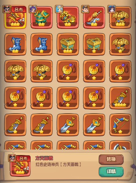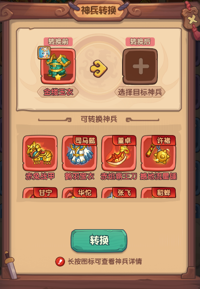 而且红色神兵还分为通用型与专属型两类,专属神兵必须由对应武将装备才能激活技能效果,其他武将装备时仅能获得属性加成。此外,可使用“神兵转换券”将一件红色神兵转换为其他红色神兵(例如将普通神兵转为专属神兵)。不过,该转换功能仅适用于红色品质神兵。