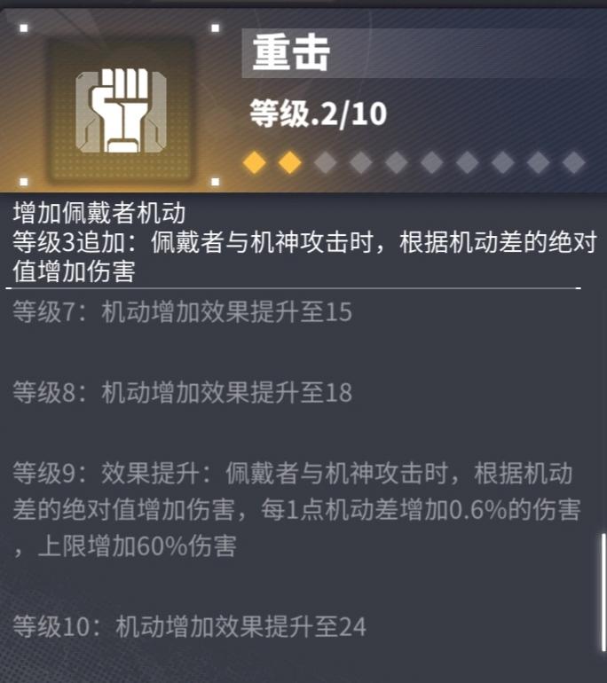 根据机动差的绝对值增加伤害,只要敌我双方的机动差能达到100,芯片佩戴者就能有60%增伤,这个数值相当不错但目前能制造出100机动差的角色很有限。部分时候用于给其他角色凑机动值。