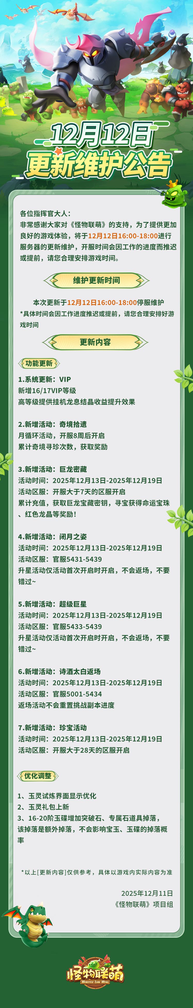 怪物联萌 维护公告