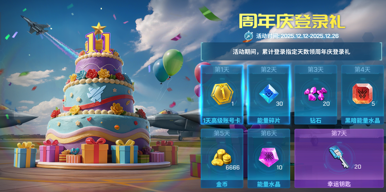 十一年,一段足以铭刻传奇的旅程。感谢每一位始终翱翔在蓝天上的飞行员,是你们的坚持、热爱与支持,让这片天空始终充满激情与活力!活动期间,只需完成指定任务,即可收集【周年庆信物】,用于兑换周年限定涂装、周年庆头像等珍稀奖励