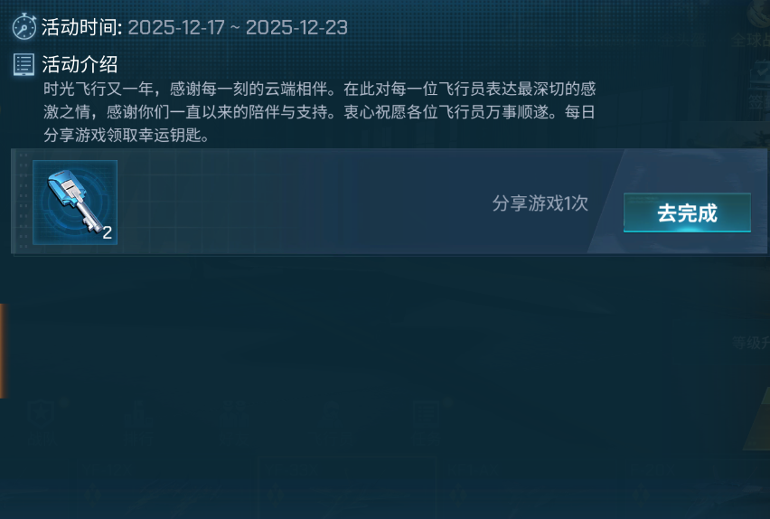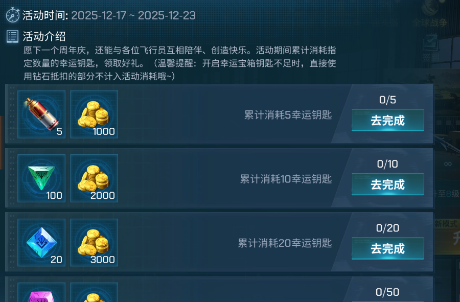 活动时间:2025-12-17~2025-12-23愿下一个周年庆,还能与各位飞行员互相陪伴、创造快乐。活动期间累计消耗指定数量的幸运钥匙,领取幸运钥匙。(温馨提醒:开启幸运宝箱钥匙不足时,直接使用钻石抵扣的部分不计入活动消耗哦~)