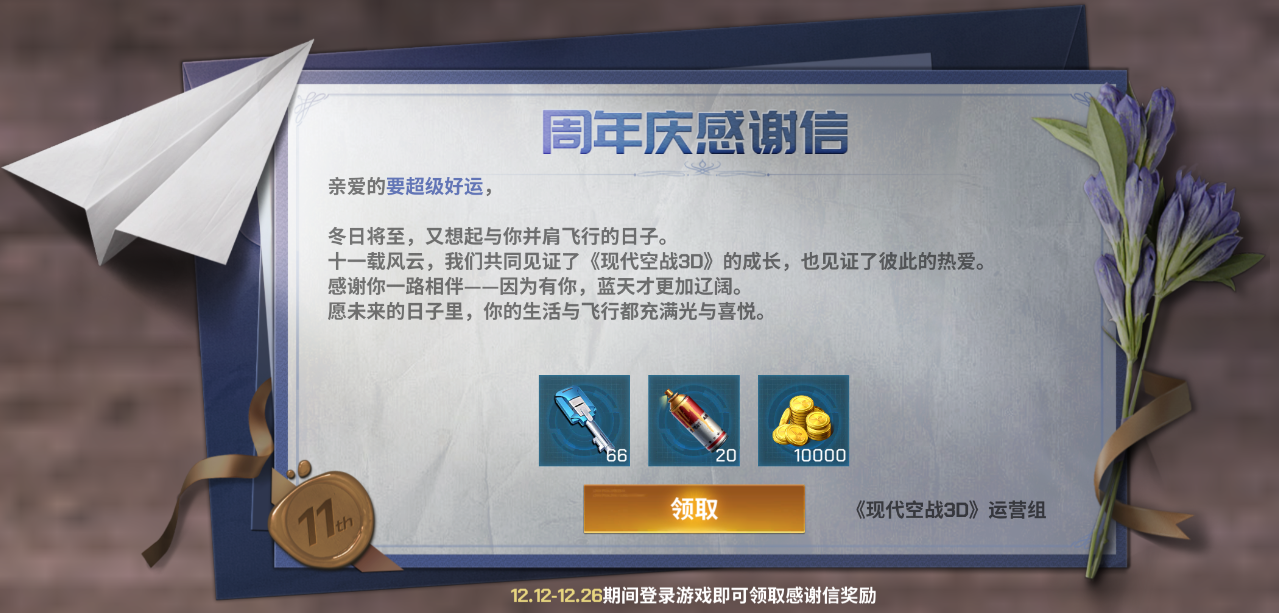 冬日将至,又想起与你并肩飞行的日子。十一载风云,我们共同见证了《现代空战3D》的成长,也见证了彼此的热爱。感谢你一路相伴--因为有你,蓝天才更加辽阔。愿未来的日子里,你的生活与飞行都充满光与喜悦。