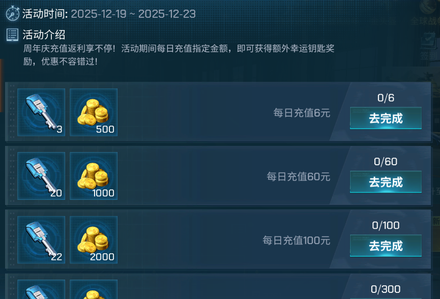 活动时间:2025-12-19~2025-12-23周年庆充值返利享不停!活动期间每日充值指定金额,即可获得额外幸运钥匙奖励,优惠不容错过!