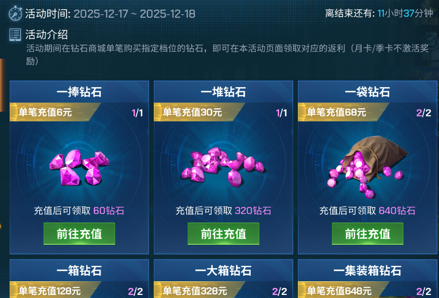 活动时间:2025-12-17~2025-12-18活动期间在钻石商城单笔购买指定档位的钻石,即可在本活动页面领取对应的返利(月卡/季卡不激活奖励)