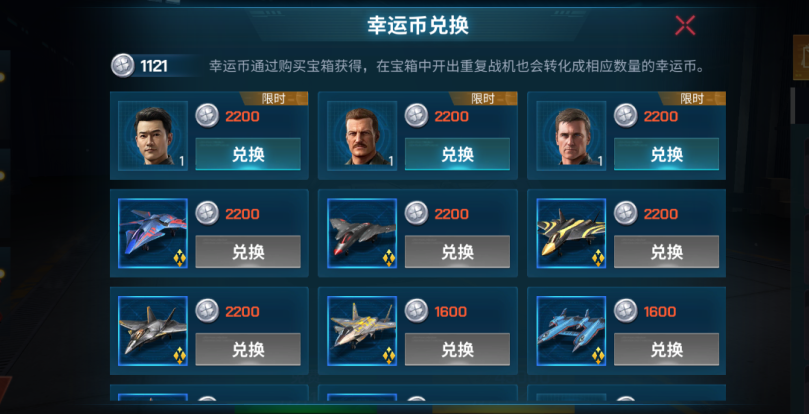 飞行员兑换-活动期间只需花费 2200 幸运币,即可兑换一名五星飞行员,为你的空中旅途保驾护航!本次上架飞行员:江天宇、罗德里格斯、霍纳。你可以根据自己的战术需求,挑选最适合的飞行员加入队伍。如果幸运币充足,也可以全部收入麾下,再也不用担心招募不到顶级飞行员,让强力飞行员助你征战蓝天,赢得每一场胜利吧!