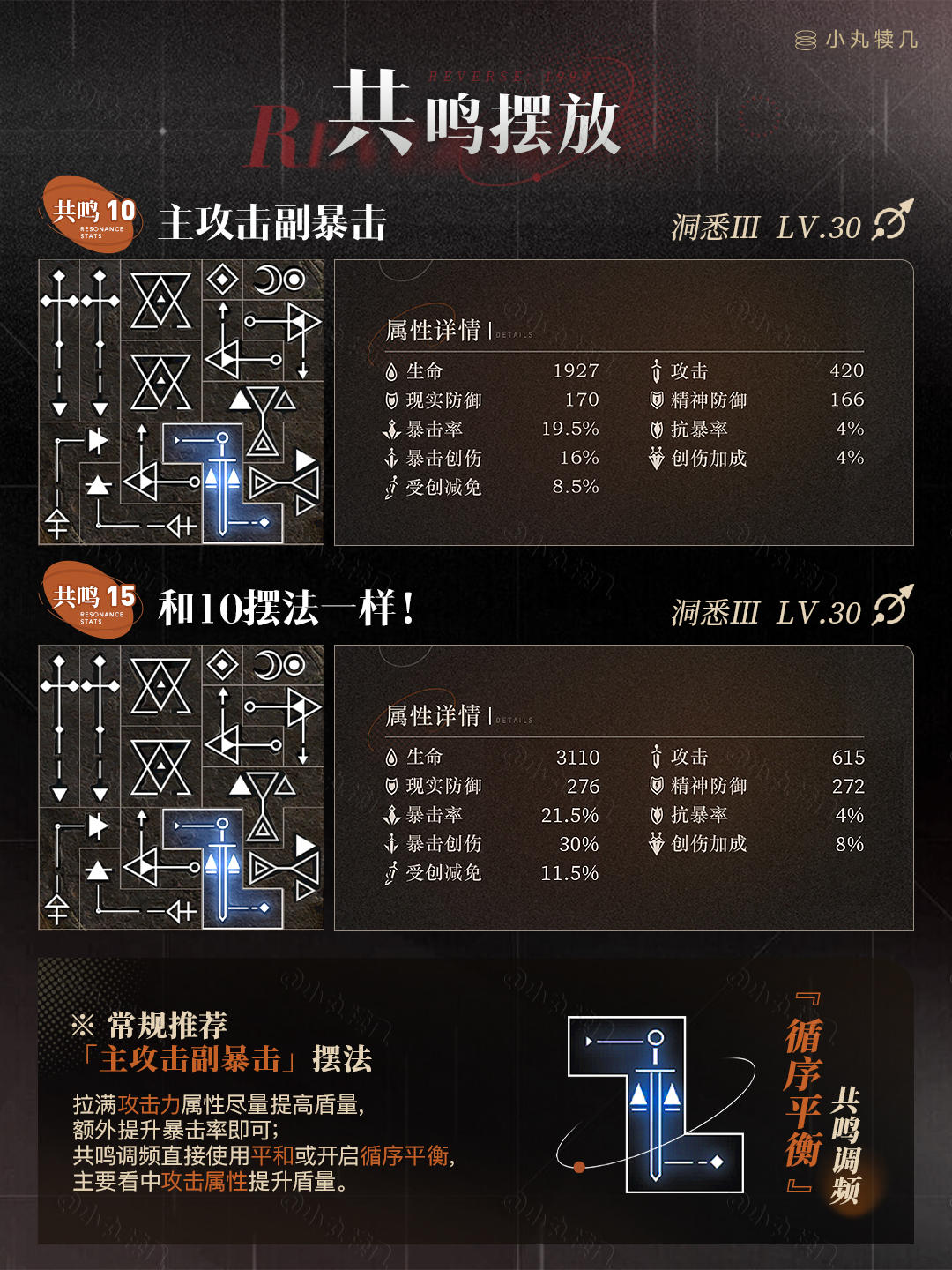 ※共鸣10&15摆法一致『主攻击副暴击』摆法: