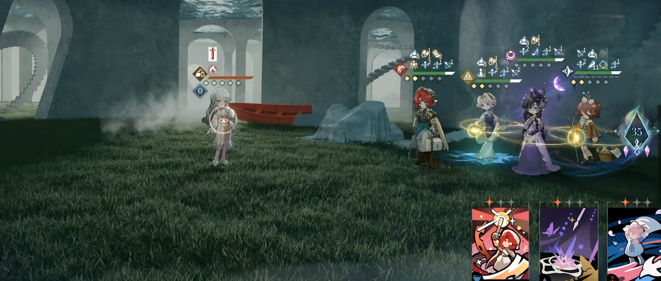 - 第 1 回合:出贝丽尔 2 技能、玛尔纱 2 技能、纸圆儿 1/2 技能,攒热度到 6。